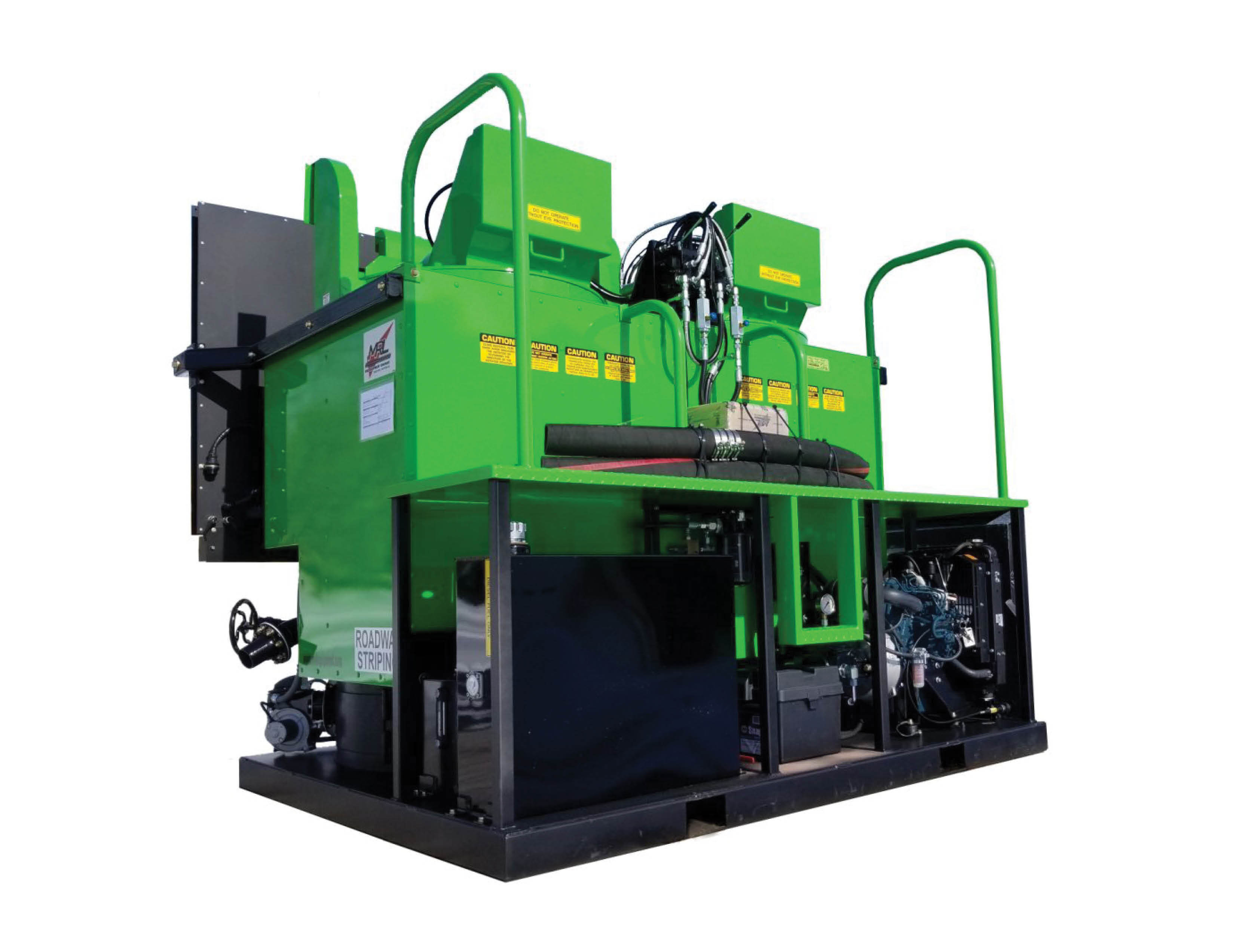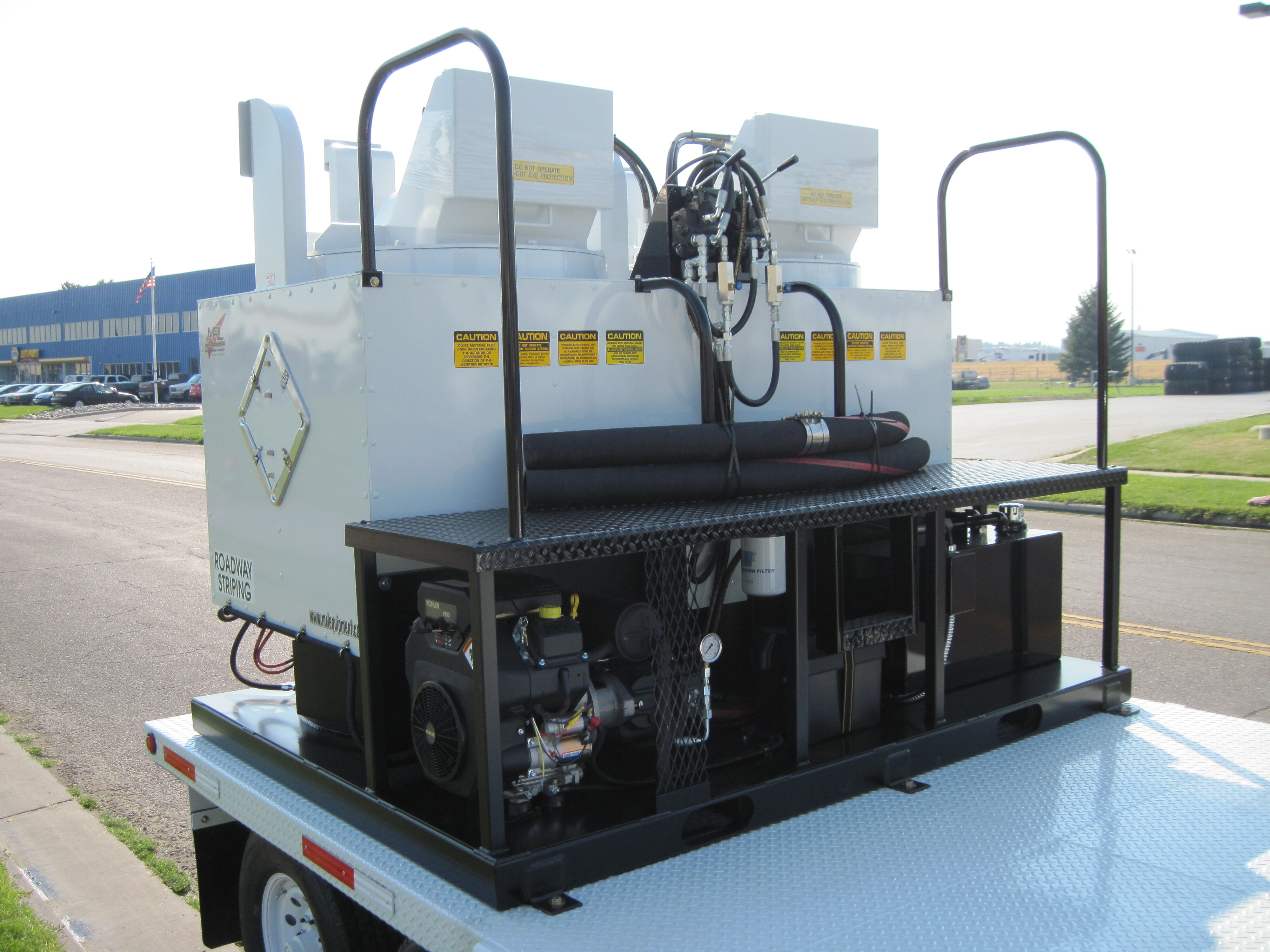 One (1) 1.5k Set capacity Diesel Fired air-jacketed, vertical design thermoplastic pre-melting kettle set (3,000 lbs. total capacity), with a 21 HP Kubota 3-cylinder diesel fueled engine to power the hydraulic requirements, with battery and battery case and hydraulic tank, 16 gallon mounted under the feed step platform. (Available to select for the 18ft and 14ft)