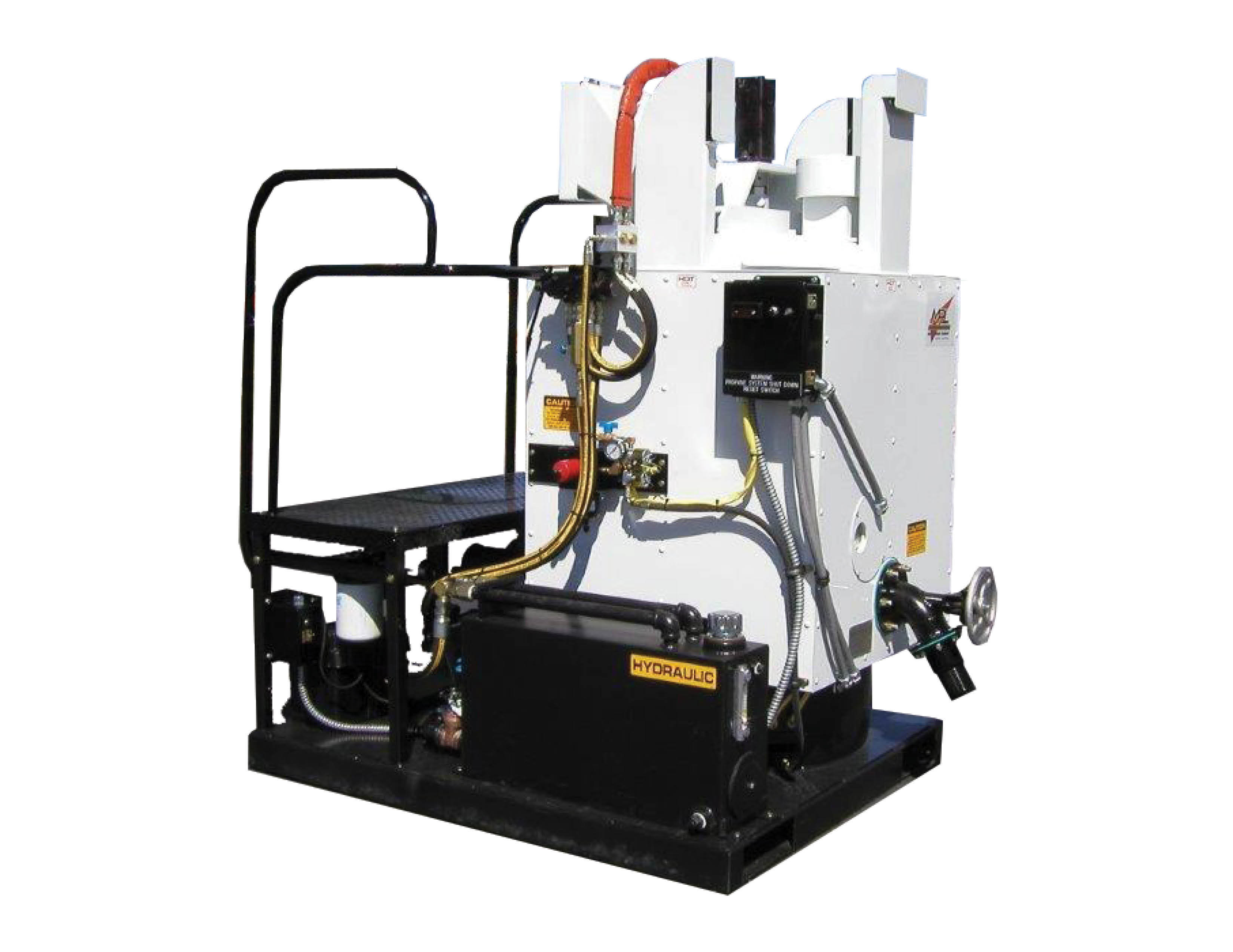 A 400 lb (182 kg) oil-jacketed, non-pressurized thermoplastic tank integrates a high-performance material pump with electronically controlled pump RPM and a digital RPM gauge. The thermostatically controlled LPG heat-transfer-oil system provides reliable temperature management through an oil circulation pump and digital controls.