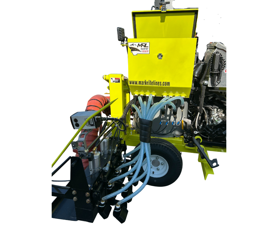 A secure travel latch is built into the front of the machine, with an optional steel trailer-bed latch available. Standard finish is Lime Squeeze Green with a silver material tank; optional colors are available for an additional charge. The unit is backed by a one-year warranty on all MRL-fabricated parts.