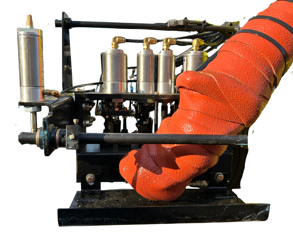 The operator benefits from an adjustable alignment pointer with air-actuated lift, with an optional laser pointer upgrade. The comprehensive safety lighting package includes three LED night-work lights—illuminating the tank fill port, forward work area, and gun carriage—along with two Whelen LED amber strobes positioned at the rear and on the elevated mast.